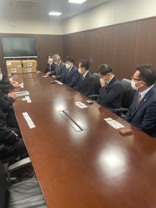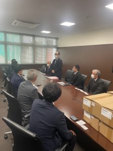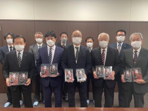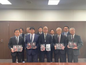 木村電機 中山所長、加賀部長と共に当組合から中川理事長、松尾副理事長、井手副理事長が開新高校(中央区)を訪問し、贈答式を行いました。